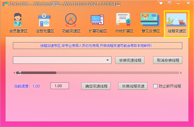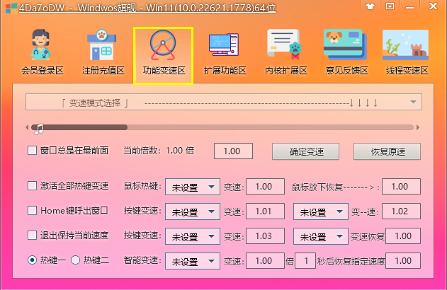 本变速程序兼容市面上所有的windows系统32/64位,不在为更换系统版本而担心兼容问题,提供宇宙级变速方案,针对系统速度有效的加速!面简洁 操作简单,功能强大 覆盖全面,效果明显 体验极佳 多种驱动级加速方案,实现多种不同的加速感觉,使您的系统速度提升N倍。